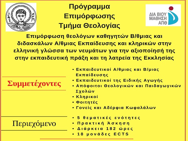 Το Τμήμα Θεολογίας του Α.Π.Θ. οργανώνει πρόγραμμα επιμόρφωσης στην ελληνική νοηματική γλώσσα. Το πρόγραμμα απευθύνεται σε θεολόγους καθηγητές Δευτεροβάθμιας και δασκάλους Πρωτοβάθμιας εκπαίδευσης καθώς και σε κληρικούς, φοιτητές και σε γονείς ή αδέρφια κωφαλάλων. Στόχος του είναι η αξιοποίηση της γλώσσας των νευμάτων στην εκπαίδευση και στη θεία λατρεία. Αποτελείται από πέντε θεματικές ενότητες, περιλαμβάνει πρακτική άσκηση και οι συμμετέχοντες, εκτός από πρακτικές γνώσεις, θα λάβουν επιπλέον μοριοδότηση για διορισμό στο δημόσιο μετά την τελική αξιολόγηση του προγράμματος. Δηλώσεις συμμετοχής μπορούν να υποβληθούν μέχρι τις 22 Σεπτεμβρίου στην ηλεκτρονική διεύθυνση http://diaviou.auth.gr/theo_deaf . Για οποιαδήποτε πληροφορία οι ενδιαφερόμενοι θα απευθύνονται στην ίδια διεύθυνση.