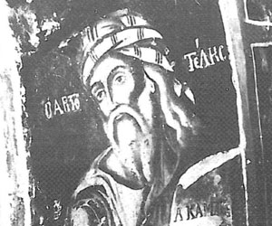 Λατρευτός ήταν ο Μέγας Αλέξανδρος, θαυμαστός κατά συνέπεια ο δάσκαλος του ο Αριστοτέλης που αν και πέρασαν είκοσι τρεις (23) αιώνες από το θάνατό του, η πνευματική του ακτινοβολία λάμπει ακόμη και στους σημερινούς καιρούς. Γι'αυτό με πολύ δισταγμό ανέλαβα στα περιορισμένα όρια μιας επιστημονικής ανακοίνωσης να παρουσιάσω τη ζωγραφική παράδοση στην παράσταση του Αριστοτέλη σε Βυζαντινούς και μεταβυζαντινούς ναούς και μοναστήρια στον ουδέτερο βαλκανικό χώρο, να σκιαγραφήσω το πρόβλημα και να δώσω τις πιθανότερες λύσεις του φαινομένου. Εικ. 2. Ο Αριστοτέλης ως Προφήτης . Τοιχογραφία Μονής Ιβήρων Αγίου Όρους, 180υ σιώνα. Να εντοπίσουμε δηλ, με τη βοήθεια της έρευνας, τις παραστάσεις εκείνες του Σταγειρίτη φιλόσοφου που σώζονται ως τις μέρες μας σε ναούς και μοναστήρια και στη συνέχεια να αποδείξουμε ...