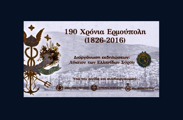 Τριήμερες εορταστικές εκδηλώσεις, για τα 190 χρόνια από την ονοματοδοσία της Ερμούπολης, θα πραγματοποιηθούν από την Παρασκευή 26 Αυγούστου έως την Κυριακή 28 Αυγούστου 2016, στην Ερμούπολη. Εντάσσονται στο πλαίσιο των πολιτιστικών εκδηλώσεων του Δήμου Σύρου – Ερμούπολης, «Σύρος – Πολιτισμός 2016». Η τελετή της ονοματοθεσίας έγινε το 1826, στη νεόκτιστη εκκλησία της Μεταμόρφωσης. Εκεί συγκεντρώθηκαν οι κάτοικοι με πρωτοβουλία του Δρόσου Μανσόλα και του Λουκά Ράλλη. «…δίκαιον και πρέπον … νομίζω, να την (την πόλη) αφιερώσωμεν εις τον Κερδώον Ερμήν, και να την ονομάσωμεν «Ερμούπολιν». Ερμούπολιν! Ερμούπολιν! Αντήχησαν πανταχόθεν όλων αι φωναί και έκτοτε καθιερώθη το όνομα της νέας πόλεως «Ερμούπολις»! Τα πρώτα χρόνια του ελληνικού κράτους, τα περισσότερα από τα ξένα πλοία σταματούσαν μόνο στο λιμάνι της Σύρου, απ' όπου γινόταν ...