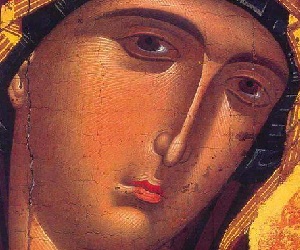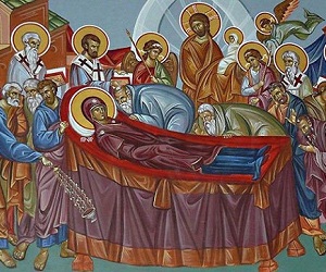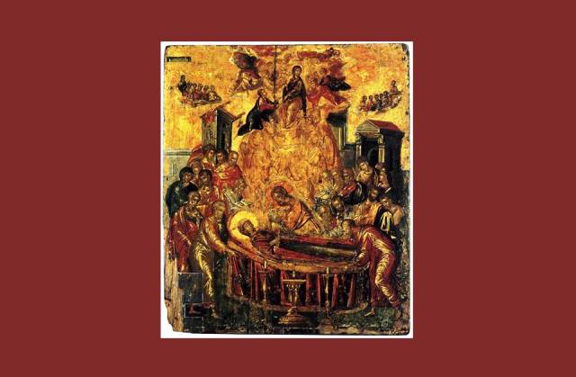 Στην Κοίμησή Σου του Ελευθερίου Μάινα Δομήνικος Θεοτοκόπουλος, Η Κοίμηση της Παναγίας των Ψαριανών, περ. 1567, τέμπερα σε ξύλο, 61,4x45 εκ., Ερμούπολη, Εκκλησία της Κοίμησης της Παναγίας. Δεν σε κρατούν σκελετωμένα δάκτυλα θανάτου, στον Άχραντο την άχραντη παρέδωκες ψυχή σου τρυγόνι, τρυφερά πριν κοιμηθείς στην αγκαλιά Του. Στην κλίνη σου έκλινε τους ουρανούς κι ο Ίδιος ήλθε, δεν εμπιστεύτηκε τον πιο πιστό αρχάγγελό Του, αδέξιος στη μεγάλη ώρα θα’ ταν υπηρέτης. Να βλέπουν μόνο, να θαυμάζουν ήλθαν οι αγγέλοι το πώς η Κεχαριτωμένη αθάνατα πεθαίνει κι από τη λογχισμένη Του πλευρά πληγής την πύλη, μοναδική που βρήκε δρόμο στης Εδέμ τον κήπο να επιστρέψει ακολουθώντας του παιδιού τα ίχνη ανέρχεται στους ουρανούς μ’ ολόσωμο το σκήνος. Φτωχό τρυγόνι, που αποκοιμήθηκες στην αγκαλιά Του δεν σε νανουρίζουν τώρα οι αγγέλοι στ’ όνειρό σου, Μεγαλυνάρια στη δόξα ...