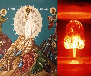 Το φως της μεγάλης γιορτής, που μας καταυγάζει τόσο γλυκά, φιλάνθρωπα και πανηγυρικά σήμερα, σκιάζει ανεπιφύλακτα ένα άλλο φως μιας σημερινής επετείου. Το πυρηνικό φως -ή καλύτερα σκότος- της πρώτης ατομικής βόμβας, που ρίχτηκε στις 6 Αυγούστου του 1945 στη Χιροσίμα, αμαυρώνει παράδοξα το θαβώριο φως της Μεταμορφώσεως. Παράδοξη είναι προφανώς και η σύμπτωση της ανάμνησης αυτής μέσα στην ίδια μέρα, αφού εδώ υπάρχει η απόλυτη αντίθεση. Από τη μια μεριά η Μεταμόρφωση και από την άλλη η τέλεια παραμόρφωση. Στο ένα μέρος η κοινωνία, ο σύνδεσμος και η σύγκραση του θείου και του ανθρώπινου, και στο άλλο η πλήρης καταστροφή και η απανθρωπία σε όλο της το μεγαλείο. Μοιάζει μάλιστα σαν να έχουμε σχεδόν την ίδια φωτογραφία σε αρνητικό και ...