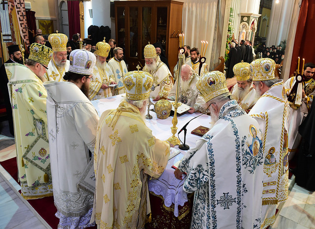 Μακαριώτατοι και Αγιώτατοι αδελφοί Προκαθήμενοι των κατά τόπους Ορθοδόξων Εκκλησιών Αλεξανδρείας κ. Θεόδωρε, Αντιοχείας κ. Ιωάννη, Ιεροσολύμων κ. Θεόφιλε, Μόσχας κ. Κύριλλε, Βελιγραδίου κ. Ειρηναίε, Βουκουρεστίου κ. Δανιήλ, Σόφιας κ. Νεόφυτε, Γεωργίας κ. Ηλία, Κύπρου κ. Χρυσόστομε, Αθηνών κ. Ιερώνυμε, Βαρσοβίας κ. Σάββα, Τιράνων κ. Αναστάσιε και Πρέσωβ κ. Ρωστισλάβε μετά των τιμίων συνοδειών Υμών, Εξοχώτατε κύριε Πρόεδρε της Ελληνικής Δημοκρατίας, Ιερώτατε Αρχιεπίσκοπε Κρήτης κύριε Ειρηναίε μετά των περί υμάς Ιερωτάτων και προσφιλεστάτων αδελφών, των συγκροτούντων την Ιεράν Επαρχιακήν Σύνοδον της εν Κρήτη Εκκλησίας, Ιερώτατοι και Θεοφιλέστατοι άγιοι αδελφοί, Ευλογημένε απανταχού της οικουμένης Ορθόδοξε Κλήρε και Λαέ, Ημέρα χαρμόσυνος ανέτειλε σήμερον, κατά την οποίαν εορτάζομεν την ιστορικήν φανέρωσιν του θεσμού της Εκκλησίας, τον οποίον συγκροτεί το Πανάγιον Πνεύμα, και συναντώμεθα πάντες οι Ορθόδοξοι αδελφοί, εκπρόσωποι ...