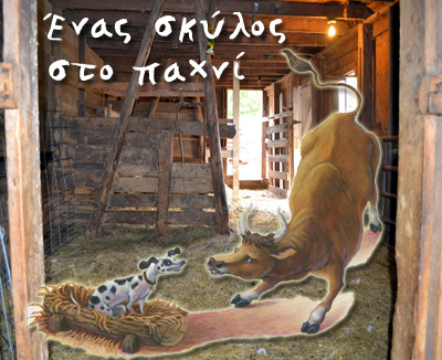 - Πολύ κουρασμένος είμαι σήμερα, πονάει η πλάτη και τα πόδια μου, είπε βαριεστημένος ο σκύλος, ο σκυλάκος, καθώς η ουρά του σερνόταν στο χώμα της αυλής… Τριγυρίζοντας λοιπόν άσκοπα στην αυλή, καθώς τα ζώα του αφεντικού του λείπανε στη δουλειά μαζί του, χώθηκε στον έρημο στάβλο. - Ζωή χαρισάμενη κάνει αυτό το βόδι, εδώ μέσα, είπε, καθώς κούρνιαζε στο ζεστό παχνί του βοδιού. Κι έκανε έναν ύπνο μα τι ύπνο! Κάτι όνειρα που μόνο ξάπλες είχαν… - Εεε, σκύλε, σκυλάκο! μούγκρισε το βόδι, σαν γύρισε από τη δουλειά του πεινασμένο και κουρασμένο! Ο σκύλος, ο σκυλάκος πετάχτηκε αγριεμένος που του χαλάσανε τον ύπνο του και: -Γαβ, γαβ, γαβ, γουβ, γουβ, γουβ, δεν είχε τελειωμό και κάθε φορά που δοκίμαζε το βόδι να πλησιάσει στο ...