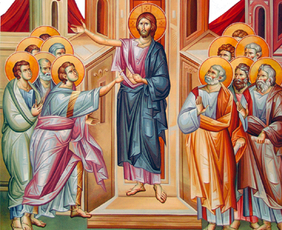 Μετά την Ανάσταση ο Κύριός μας εμφανίστηκε αρκετές φορές στους μαθητές του. Την πρώτη φορά που εμφανίσθηκε οι μαθητές ήταν όλοι μαζί, μαζεμένοι σ΄ ένα σπίτι. Τότε, κι ενώ οι πόρτες ήταν κλειστές, εμφανίσθηκε μπροστά τους ο αναστημένος Ιησούς και συνομίλησε μαζί τους. Ο Θωμάς όμως, ένας από τους δώδεκα μαθητές, που λεγόταν Δίδυμος, δεν ήταν εκεί όταν ήρθε ο Κύριος. Οι άλλοι μαθητές του είπαν ότι είδαν τον Κύριο, αλλά εκείνος έλεγε ότι δεν θα πιστέψει παρά μόνο αν δει με τα μάτια του τα σημάδια από τα καρφιά και βάλει το δάχτυλό του στις πληγές των καρφιών και το χέρι του στην τρυπημένη πλευρά του. Πέρασαν οκτώ μέρες κι ήταν πάλι όλοι οι μαθητές συγκεντρωμένοι κι αυτή τη φορά ...