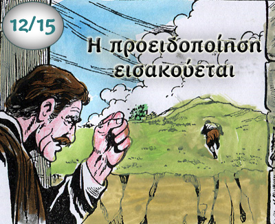 - Ήρθαν κλέφτες! επανέλαβε η φωνή του βοσκού. Ήρθαν κουρσάροι! Τους είδα με τα μάτια μου. - Κλέφτες; Κουρσάροι; ξαναείπε ο μπαρμπα-Δήμος. - Σύρε να πεις στους προεστούς, πες και στον κυρ Αναγνώστη, τ΄ αφεντικό μου, χαιρετίσματα πολλά από μένα, ήρθαν κουρσάροι. Τους είδα πάνω στον Σταυρό! Έτσι, να ΄χω καλό τέλος. Είδα περισσότερους από δέκα-δώδεκα. Θα είναι κι άλλοι κρυμμένοι. Δεν ξέρω που έχουν αραγμένο το καΐκι τους... Ωστόσο τους είδα! Ήρθαν σε μένα να ρωτήσουν τον δρόμο για το Κάστρο. Ο μπαρμπα-Δήμος άρχισε να παίρνει το πράγμα υπόψη του πιο σοβαρά. Εντούτοις δεν ήθελε ν΄ αφήσει εντελώς την αντιλογία του. - Μην είδες όνειρο, άνθρωπε; φώναξε. Πού θε να βρεθούν κουρσάροι; - Τους είδα, σου λέω, με τα μάτια μου. Όπου είναι έφτασαν! ...