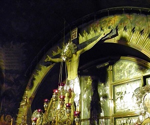Ο αμετακίνητος Σταυρός του Γολγοθά Κείμενο-φωτογραφίες: Μαρία Χρ. Αλβανού «Σήμερον κρεμάται επί ξύλου, ο εν ύδασι την γην κρεμάσας…». Σε όλες τις ορθόδοξες εκκλησίες ενώ με κατάνυξη ψέλνονται με τον πιο ποιητικό τρόπο τα Πάθη του Κυρίου ο Σταυρός που βρίσκεται μέσα στο Ιερό βγαίνει και περνά μπροστά από τους πιστούς. Μόνο σε έναν ναό της Ορθοδοξίας τη στιγμή εκείνη τα λόγια αυτά ακούγονται χωρίς την πομπή της αναπαράστασης της Σταύρωσης. Στα Ιεροσόλυμα, στον Ναό της Αναστάσεως, όταν γίνεται η ακολουθία του Εσπερινού της Μεγάλης Πέμπτης δεν βγαίνει από το Ιερό ο Σταυρός και δεν περνά μπροστά από τους πιστούς. Το αντίφωνο ψάλλεται και τα Ευαγγέλια αναγιγνώσκονται στη σκιά του Γολγοθά. Και ο Εσταυρωμένος του Γολγοθά δεν μετακινείται ποτέ. Μένει σταθερά εκεί ...