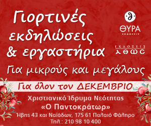 Τα μεσημέρια των τριών πρώτων Κυριακών του Δεκεμβρίου (4, 11 και 18) το Χριστιανικό Ίδρυμα «Ο ΠΑΝΤΟΚΡΑΤΩΡ» προσκαλεί μικρούς και μεγάλους να συμμετάσχουν σε πλούσιες εορταστικές εκδηλώσεις και εργαστήρια που οργανώνουν οι εκδόσεις ΑΘΩΣ και ΘΥΡΑ με τη συμμετοχή διακεκριμένων συγγραφέων, μουσικών και εικαστικών καλλιτεχνών. Το Χ.Ι. Νεότητος «Ο ΠΑΝΤΟΚΡΑΤΩΡ» δημιουργήθηκε το 1957 από τον μακαριστό Καθηγούμενο της Ιεράς Μονής Οσίου Γρηγορίου Αγίου Όρους, π. Γεώργιο Καψάνη και αποτελεί ένα πνευματικό και πολιτιστικό κέντρο με σημαντικές δραστηριότητες για τη νεολαία. Παράλληλα με τις εκδηλώσεις θα λειτουργεί δωροέκθεση και έκθεση βιβλίου τα έσοδα των οποίων θα διατεθούν για την ενίσχυση των δράσεων του ιδρύματος. Η αίθουσα βρίσκεται επί της οδού Ήβης 43 και Ναϊάδων, 175 61 Παλαιό Φάληρο, και το τηλέφωνο επικοινωνίας είναι 210 98 10 ...