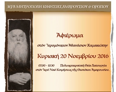 Η Ιερά Μητρόπολις Κηφισίας, Αμαρουσίου και Ωρωπού, με αφορμή την έκδοση του Ημερολογίου τσέπης 2017, το οποίο είναι αφιερωμένο στον Ιερομόναχο Αθανάσιο Χαμακιώτη, εφημέριο του Ιερού Ναού Παναγίας Νερατζιωτίσσης και Ιδρυτήν του Ιερού Ησυχαστηρίου Παναγίας Φανερωμένης Ροδοπόλεως και την συμπλήρωση πενήντα (50) ετών από την Κοίμησή του (1967-2017), διοργανώνει ειδικό αφιέρωμα για τον Γέροντα της Νερατζιωτίσσης, την Κυριακή 20 Νοεμβρίου 2016 σύμφωνα με το ακόλουθο πρόγραμμα: 7.00-10.30 · Πολυαρχιερατική Θεία Λειτουργία στον Ιερό Ναό Κοιμήσεως της Θεοτόκου Αμαρουσίου. 11:00 - 11:30 ·Προσέλευση στο Δημαρχείο Αμαρουσίου (Βασιλίσσης Σοφίας 9 & Δημ. Μόσχα) – Κέρασμα. 11.30-11.40· Προβολή οπτικοακουστικού αφιερώματος για τον Γέροντα Αθανάσιο Χαμακιώτη. 11.40-12.10·Ομιλία με θέμα: «Ιερομόναχος Αθανάσιος Χαμακιώτης, ο Γέροντας της Νερατζιωτίσσης» υπό του Σεβασμιωτάτου Μητροπολίτου Αργολίδος κ. Νεκταρίου. 12.10-12.20 ·Αποφώνησις υπό του Σεβασμιωτάτου Ποιμενάρχου ...