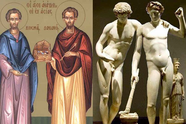 Λέγεται ακόμη, πως και οι δύο ήσαν γιοι του Δία, αλλά ο Κάστωρ πέθανε πριν ο πατέρας τους τούς χαρίσει την αθανασία. Ο Δίας, τότε, επέτρεψε τα δύο αδέλφια να περνούν τις ημέρες τους εκ περιτροπής, μία στον ουρανό και μία κάτω από την γη. Ως ανταμοιβή για την αγάπη που διακατείχε τον έναν προς τον άλλον, ο Δίας τοποθέτησε τις μορφές τους ανάμεσα στα άστρα του ουρανού. Διακρίνονται στο στερέωμα ως ο αστερισμός των Διδύμων. Όπως αρκετά αρχαιοελληνικά έθιμα ή αντιλήψεις συνέχισαν να υπάρχουν, με διαφορετικό βέβαια μανδύα, μέσα στον Χριστιανισμό, έτσι και οι Διόσκουροι, πέρασαν στην νέα θρησκεία, από τους Ελληνίζοντες χριστιανούς, ως οι Άγιοι Ανάργυροι. Σε αυτή την άποψη καταλήγει και ο Γερμανός φιλόλογος και θρησκειολόγος Λούντβιχ Ντόιμπνερ ...