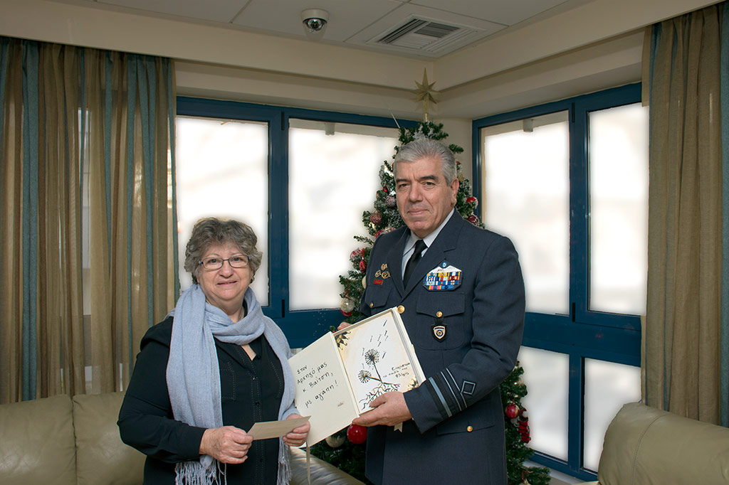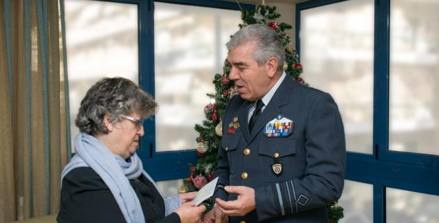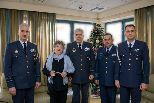 Είναι η στιγμή που η κ. Μαρία Τρυφωνίδου, πρόεδρος του συλλόγου Γονέων Παιδιών με Νεοπλασματική Ασθένεια «Φλόγα», παραλαμβάνει την επιταγή με το ποσό που συγκέντρωσε το προσωπικό της Πολεμικής Αεροπορίας ως δωρεά.
