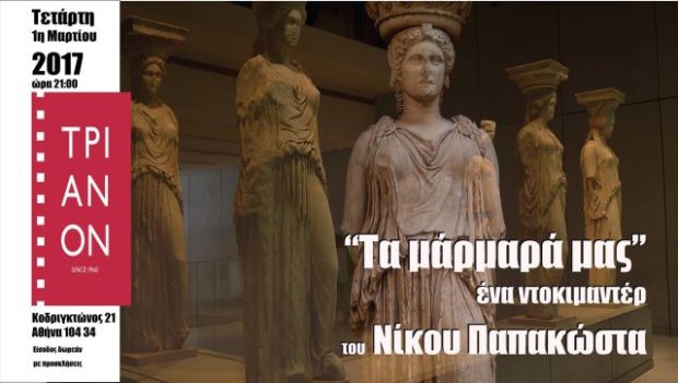 “Τα μάρμαρα μας” του Νίκου Παπακώστα, ένα ντοκιμαντέρ που αφορά στα γλυπτά ή μάρμαρα του Παρθενώνα, Ο όρος ‘τα μάρμαρα μας’ είναι αυτός που έγινε γνωστός από την Μελίνα Μερκούρη που είπε λίγο πριν το θάνατό της: “Ελπίζω να δω τα Μάρμαρα πίσω στην Αθήνα προτού πεθάνω…” και αν και πολλοί διαφωνούν με το δόκιμο ή όχι του όρου η γνώμη μου είναι ότι δείχνει την αγάπη και την τρυφερότητα που τα είχει περιβάλει η Μελίνα και ο ελληνικός λαός. Συμμετέχουν λοιπόν πολλοί και σπουδαίοι άνθρωποι των γραμμάτων και των τεχνών, οι οποίοι στηρίζουν την ελληνική θέση για την επιστροφή των μαρμάρων του Παρθενώνα στον τόπο τους. Σας περιμένουμε όλους. Ο πολιτισμός είναι υπόθεση όλων μας. ΕΙΣΟΔΟΣ ΕΛΕΥΘΕΡΗ!