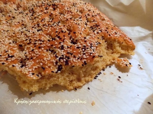 Πασπαλίζουμε με μπόλικο σουσάμι και με μαυροσίσαμο και με τα δάκτυλά μας κάνουμε τα χαρακτηριστικά βαθουλώματα. Ωστόσο το λαμπάκι του φούρνου θα έχει σβήσει. Φουρνίζουμε και ψήνουμε για μισή ώρα περίπου στη μεσαία σχάρα.