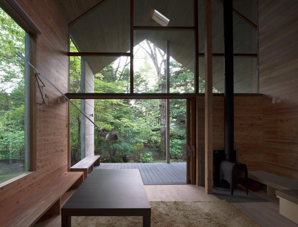 Aυτή η αίσθηση της γεωγραφικής δυστοπίας οφείλεται στο ίδιο το φυσικό τοπίο της Karuizawa: τα πεύκα στο βραχώδες τοπίο των λόφων δημιουργούν κάτι το «μη ιαπωνικό». Αντί για τα μεγάλα ανοιχτά χωράφια που συνηθίζουμε να βλέπουμε στην ιαπωνική επαρχία, εδώ η πόλη αρθρώνει την αλπική αισθητική της που ολοκληρώνεται με εξωτικές κατοικίες όπου το καφέ του ξύλινου συρματοπλέγματος διακλαδώνεται πάνω στους άσπρους ασβεστωμένους τοίχους. Τα πάντα μοιάζουν σαν να στήνουν την ιαπωνική ονειρική απεικόνιση ενός δυτικού ειδυλλιακού καταφύγιου.
