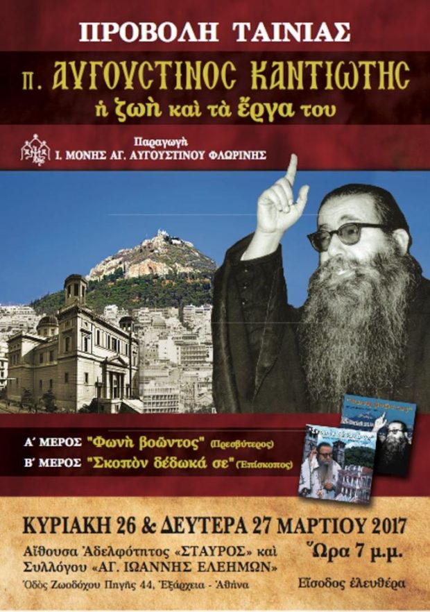 Ταινία σε παραγωγή της Ιεράς Μονής Αγ.Αυγουστίνου Φλωρίνης με θέμα τη ζωή και τα έργα του Αυγουστίνου Καντιώτη θα προβληθεί στην Αθήνα (αίθουσα της οδ. Ζωοδόχου Πηγής 44 στα Εξάρχεια) την Κυριακή 26 Μαρτίου 2017 και τη Δευτέρα 27 Μαρτίου 2017 ώρα 7 μ.μ.
