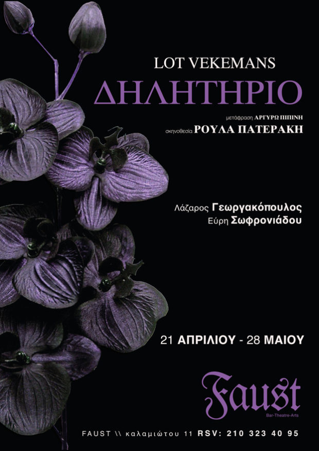 Ιnfo: Από την Παρασκευή 21 Απριλίου και κάθε Παρασκευή, Σάββατο και Κυριακή στις 9.00 μ.μ. (μέχρι την Κυριακή 28 Μαΐου). Τιμές εισιτήριων: Κανονικό:12€, Φοιτητικό 10€, 5€ (άνεργοι, ατέλειες). Διάρκεια: 90 λεπτά. Θέατρο “Faust”: Καλαμιώτου 11, Αθήνα. Τηλ. Επικοινωνίας: 21 0323 4095