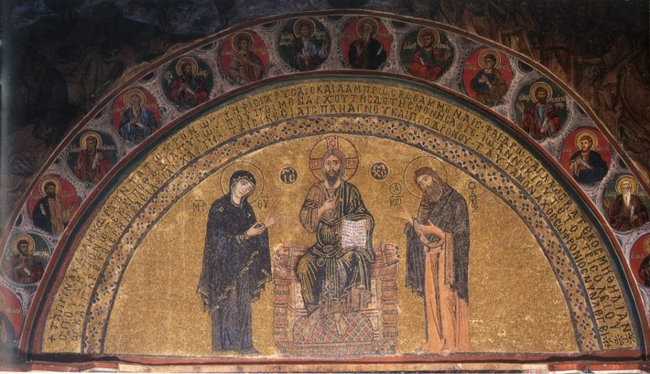 Above the entrance leading from the exonarthex to the narthex, in a semi-circular shallow lunette, is the scene of the Deisis (Fig. 184). Christ is shown in the middle, sitting on a backless throne and resting His feet on a richly decorated footstool. With His right hand He gives His blessing and with His left He holds an open Gospel book, which is resting on His knee. The pages of the Gospel have the words: “I AM THE LIGHT OF THE WORLD THE TRUTH THE LIFE THE RESURRECTION THE WAY THE SHEPHERD THE DOOR THROUGH ME IF ONE ENTERS IN HE WILL BE SAVED”. The text of this inscription, which is a compilation of phrases from the Gospel according to John (Jn. ...