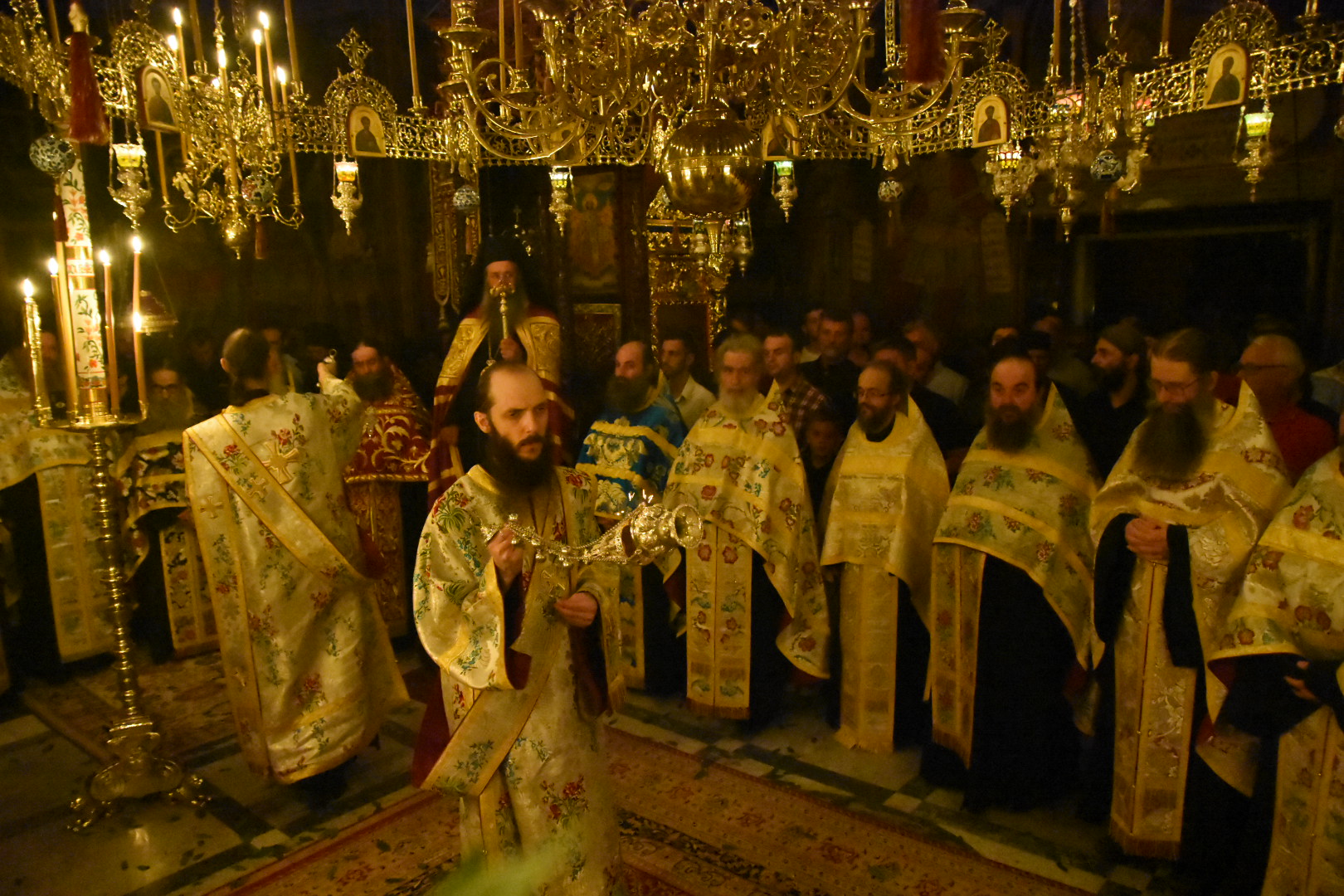 Το βράδυ της ίδιας ημέρας άρχισε 12ωρη συνεχόμενη Αγρυπνία, η οποία περιλάμβανε τον Μέγα Εσπερινό, τη Λιτή, τον Όρθρο, τις Ώρες, τη Θ. Λειτουργία και την ευλόγηση των κολύβων του εορταζομένου Αγίου. Η Αγρυπνία ολοκληρώθηκε στις 8.00 το πρωί της κυριώνυμης ημέρας, ενώ κατά τη διάρκειά της τέθηκε σε προσκύνηση τεμάχιο από το ι. λείψανο του Αγίου.