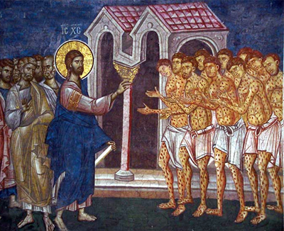 Στα περίχωρα μια κωμόπολης, όπου πήγε κάποτε ο Κύριός μας, και πριν περάσει τα τείχη της κατοικημένης αυτής περιοχής, άκουσε μια θλιβερή και παραπονετική κραυγή. Γύρισε προς το μέρος απ΄ όπου φάνηκε να είχε έρθει η φωνή και είδε δέκα δυστυχισμένους ανθρώπους. Ήταν λεπροί· ήταν άρρωστοι από μια ασθένεια για την οποία την εποχή εκείνη δεν υπήρχε κανένα φάρμακο για να τη θεραπεύσει, δηλ. αυτοί οι άνθρωποι ήταν καταδικασμένοι. Επειδή μάλιστα η ασθένεια αυτή είναι ιδιαιτέρως κολλητική, δεν τους επέτρεπαν να κατοικούν μέσα στην πόλη, αλλά έξω από τα τείχη της. Έτσι, οι δυστυχισμένοι λεπροί περνούσαν τη μέρα τους ζητώντας βοήθεια από τους διαβάτες και το βράδυ κατέφευγαν, συνήθως, στα νεκροταφεία, που βρίσκονταν κι αυτά έξω από τις πόλεις και ...