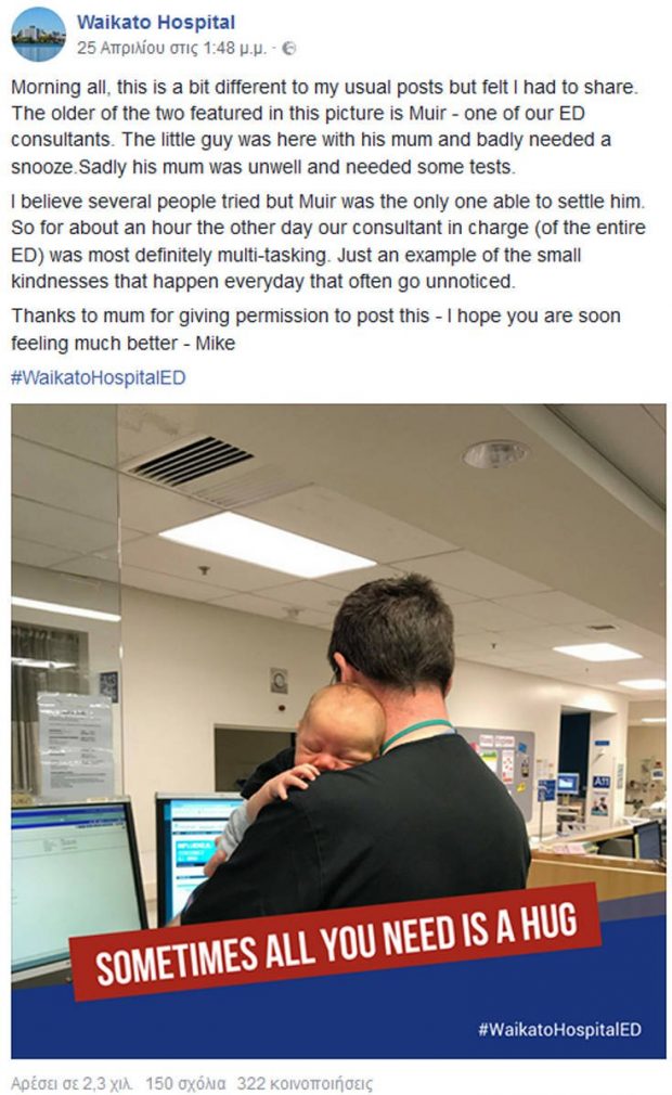 Η εικόνα άρεσε τόσο που ακόμα και το νοσοκομείο τη μοιράστηκε από την επίσημη σελίδα του, γράφοντας χαρακτηριστικά: «Κάποιες φορές το μόνο που χρειάζεσαι είναι μια αγκαλιά»…