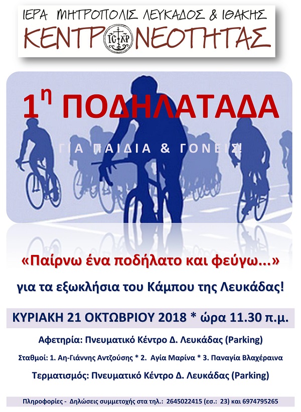 1η Ποδηλατάδα για μικρούς και μεγάλους Το Κέντρο Νεότητας της Ι. Μ. Λευκάδος και Ιθάκης προσκαλεί μικρούς και μεγάλους, γονείς και παιδιά να πάρουν τα ποδήλατά τους την ερχόμενη Κυριακή 21 Οκτωβρίου 2018 και να συμμετάσχουν σε μια αλλιώτικη Ποδηλατάδα. Με αφετηρία τον χώρο στάθμευσης (parking) πίσω από το Πνευματικό Κέντρο του Δήμου Λευκάδας θα ξεκινήσουμε όλοι μαζί, καιρού επιτρέποντος, στις 11.30 π.μ. για μια βόλτα σε τρία εξωκλήσια της Λευκάδας. Πρώτος μας σταθμός, το εξωκλήσι του Αη-Γιάννη του Αντζούση, στην ομώνυμη παραλία. Στη συνέχεια, το εκκλησάκι της Αγίας Μαρίνας και ύστερα, της Παναγίας των Βλαχερνών στον Κάμπο της Λευκάδας. Τερματισμός, πάλι στο Πνευματικό Κέντρο του Δήμου. Η συμμετοχή είναι δωρεάν. Πληροφορίες στα τηλ.: 2645022415, εσ.: 23 και 6974795265. Σας περιμένουμε σε αυτή την όμορφη ...