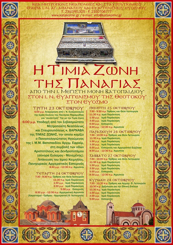 Η Ιερά Μητρόπολις Νεαπόλεως και Σταυρουπόλεως έχει την εξαιρετική τιμή και ευλογία να υποδεχθεί και να φιλοξενήσει στον Ι. Ν. Ευαγγελισμού της Θεοτόκου Ευόσμου την Τιμία Ζώνη της Υπεραγίας Θεοτόκου από την Ι. Μ. Μ. Βατοπαιδίου Αγίου Όρους, από την Τρίτη 23 Οκτωβρίου έως και την Κυριακή 28 Οκτωβρίου 2018. Την Τιμία Ζώνη θα κομίσει ο Πανοσιολογιώτατος Ηγούμενος της Ι. Μ. Αρχιμανδρίτης Εφραίμ και θα υποδεχθεί ο Σεβασμιώτατος Μητροπολίτης Νεαπόλεως και Σταυρουπόλεως κ. Βαρνάβας, επικεφαλής του Ιερού κλήρου της Μητροπόλεως και του ευσεβούς λαού. Η υποδοχή του μοναδικού κειμηλίου της Ορθοδοξίας μας θα γίνει την Τρίτη 23 Οκτωβρίου 2018 και ώρα 6:00μ.μ. στη συμβολή των οδών Δενδροποτάμου και Αριστοτέλους (σύνορα Ευόσμου – Μενεμένης). Θα ακολουθήσει λιτάνευση του Ιερού Κειμηλίου, Πανηγυρικός Αρχιερατικός Εσπερινός και ...