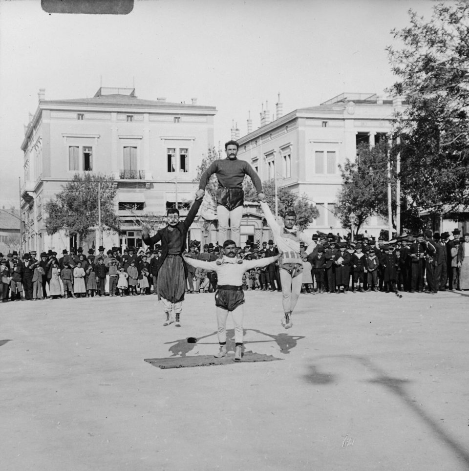 Ακροβάτες στην πλατεία Συντάγματος. Στο βάθος διακρίνονται τα μέγαρα Ιωάννου Βούρου και Στεφάνου Σκουλούδη. Φωτογραφία Alexander Lamont Henderson. Μουσείο Μπενάκη