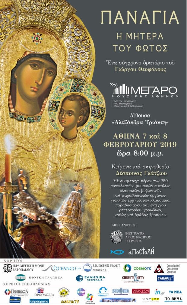 Το Ινστιτούτο «Άγιος Μάξιμος ο Γραικός», το οποίο τελεί υπό την αιγίδα της Ιεράς Μεγίστης Μονής Βατοπαιδίου και έχει ως σκοπό την έρευνα, διάσωση και προβολή των πνευματικών και πολιτιστικών μας παραδόσεων και η «Αποστολή» της Αρχιεπισκοπής Αθηνών θα προβούν στην παρουσίαση ενός σύγχρονου ορατόριου για την Παναγία με τίτλο «Παναγία – Η Μητέρα του Φωτός» του συνθέτη Γιώργου Θεοφάνους, σε κείμενα και σκηνοθεσία της Δέσποινας Γκάτζιου.