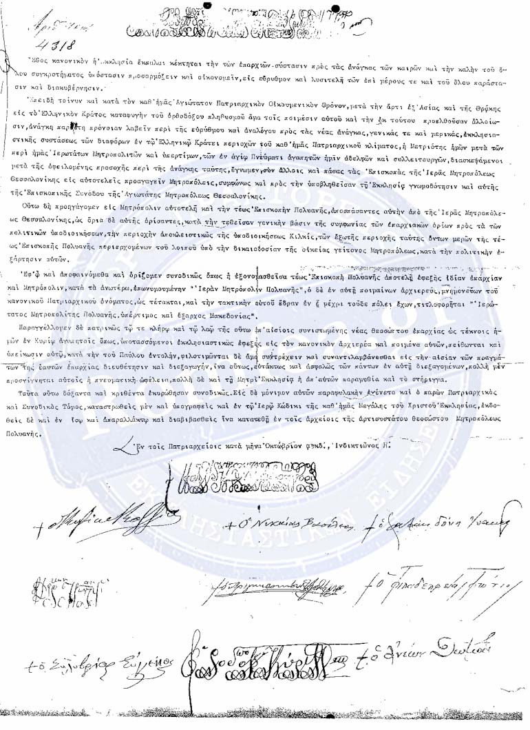 Άξιο αναφοράς είναι επίσης ότι τον Οκτώβριο του 1924 το Οικουμενικό Πατριαρχείο Κωνσταντινουπόλεως ανύψωσε την Επισκοπή Πολυανής, με Πατριαρχική και Συνοδική Πράξη, την οποία παραθέτουμε, εις αυτοτελή Ιερά Μητρόπολη με όρια της “την περιοχήν αποκλειστικώς της υποδιοικήσεως Κιλκίς” όπως σχετικά αναφέρει η Πράξις.