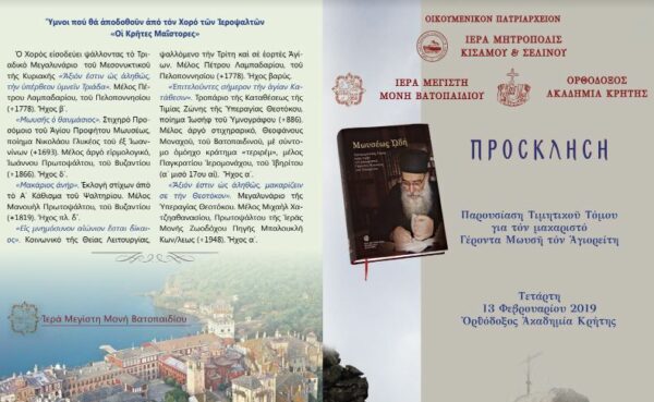 Η Ιερά Μητρόπολις Κισάμου και Σελίνου προβαίνει εις την παρουσίαση Τιμητικού Τόμου αφιερωμένο εις τον μακαριστό Γέροντα Μωυσή τον Αγιορείτη, τον οποίο επιμελήθηκε και εξέδωσε η Ι. Μεγίστη Μονή Βατοπαιδίου. Πρόκειται περί μίας εξαιρετικής και ιδιαίτερα επιμελημένης και φροντισμένης έκδοσις.