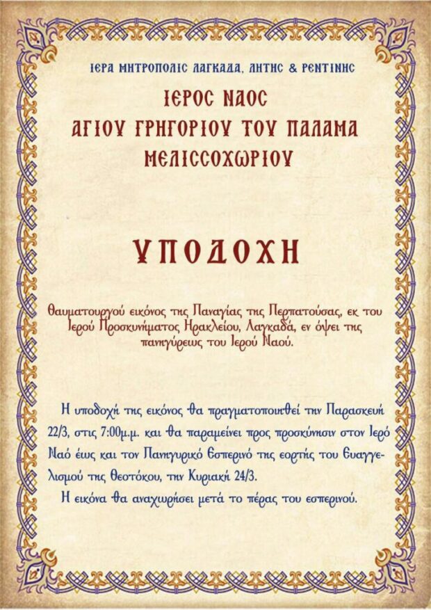 Υποδοχή της θαυματουργού εικόνος της Παναγίας της Περπατούσας θα λάβει χώρα στον Ιερό ναό Αγίου Γρηγορίου του Παλαμά Μελισσοχωρίου. Η υποδοχή θα πραγματοποιηθεί την
