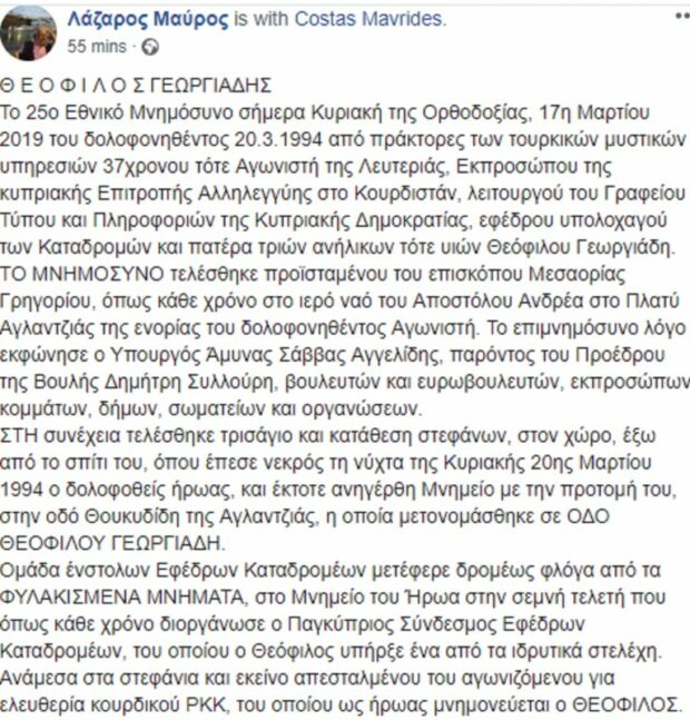 Με αισθήματα βαθιάς συγκίνησης και εθνικής περηφάνιας βρισκόμαστε σήμερα εδώ, για να αποτίσουμε τον ελάχιστο φόρο τιμής σε ένα γνήσιο και ανυποχώρητο αγωνιστή της ελευθερίας, έναν σπουδαίο άνθρωπο, έναν εθνικό και συνάμα παγκόσμιο επαναστάτη, τον Θεόφιλο Γεωργιάδη, που δολοφονήθηκε το 1994 από όργανα των μυστικών υπηρεσιών της Τουρκίας, έξω από το σπίτι του στην Αγλαντζιά.