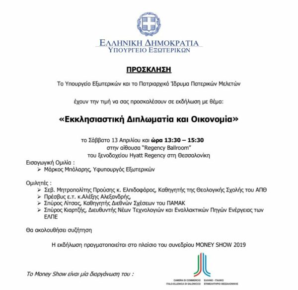 Το Υπουργείο Εξωτερικών και το Πατριαρχικό Ίδρυμα Πατερικών Μελετών έχουν την τιμή να μάς προσκαλέσουν σε εκδήλωση με θέμα: «Εκκλησιαστική Διπλωματία και Οικονομία», το Σάββατο 13 Απριλίου και ώρα 13:30 – 15:30 στην αίθουσα “Regency Ballroom” του ξενοδοχείου Hyatt Regency στη Θεσσαλονίκη.
