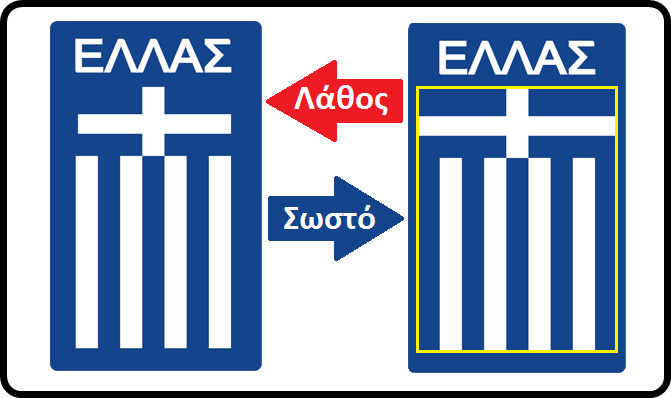 Που είναι το σφάλμα; Αν προσέξει κανείς το σήμα της εθνικής Ελλάδος στις ποδοσφαιρικές εμφανίσεις θα δει ότι το οριζόντιο τμήμα του σταυρού έχει εύρος που είναι ίσο με επτά κάθετες, κυανές και λευκές γραμμές, ενώ το σωστό θα ήταν να έχει εύρος εννέα καθέτων γραμμών, αλλά και πάλι με την προϋπόθεση ότι αποδεχόμεθα αυτόν τον τύπο της κάθετης σημαίας, διότι ο σταυρός πρέπει να έχει εύρος όσο πέντε κάθετες γραμμές. Πρέπει να αποτυπωθεί όπως ακριβώς είναι η σημαία μας.