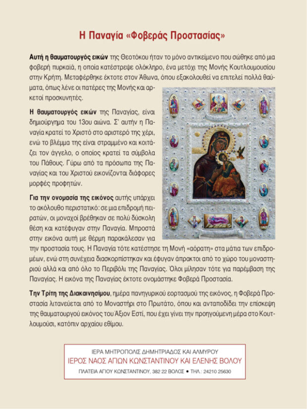 Τη Θαυματουργό Ιερά Εικόνα της Παναγίας «Φοβεράς Προστασίας», η οποία φυλάσσεται στην Ιερά Μονή Κουτλουμουσίου στο Περιώνυμο Περιβόλι της Παναγίας μας, στο Άγιο Όρος, θα έχει την ευλογία να φιλοξενήσει ο Ιερός Ναός των Αγίων Κωνσταντίνου και Ελένης Βόλου, στα πλαίσια του Ετήσιου Εορτασμού των Αγίων, από τις 19 έως και τις 26 Μαΐου του τρέχοντος έτους.