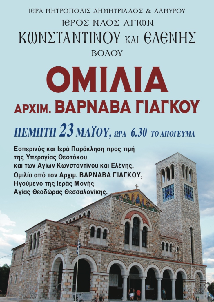 Ομιλία από τον Αρχιμ. Χριστόδουλο, Καθηγούμενο της Ιεράς Μονής Κουτλουμουσίου Αγίου Όρους με θέμα: «Οι Άγιοι Κωνσταντίνος και Ελένη»
