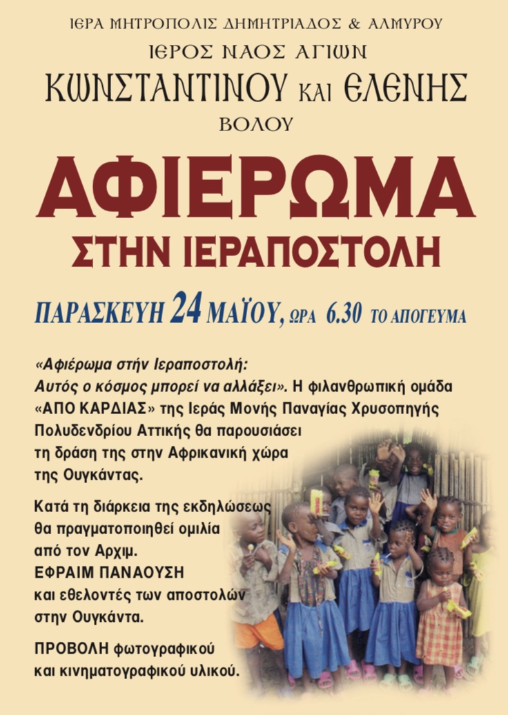 «Αφιέρωμα στήν Ιεραποστολή: Αυτός ο κόσμος μπορεί να αλλάξει». Η φιλανθρωπική ομάδα “ΑΠΟ ΚΑΡΔΙΑΣ”της Ιεράς Μονής Παναγίας Χρυσοπηγής Πολυδενδρίου Αττικής θα παρουσιάσει τη δράση της στην Αφρικανική χώρα της Ουγκάντας. Κατά τη διάρκεια της εκδηλώσεως θα πραγματοποιηθεί ομιλία από τον Αρχιμ. Εφραίμ Παναούση και εθελοντές των αποστολών στην Ουγκάντα. Προβολή φωτογραφικού και κινηματογραφικού υλικού.