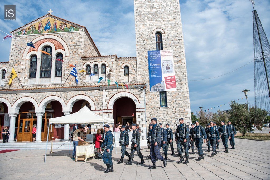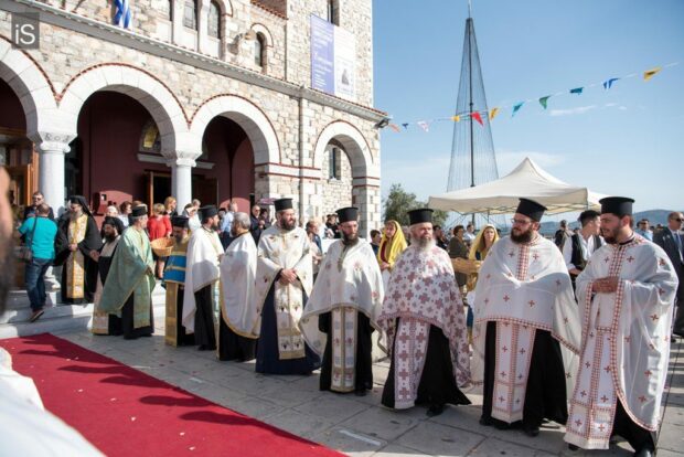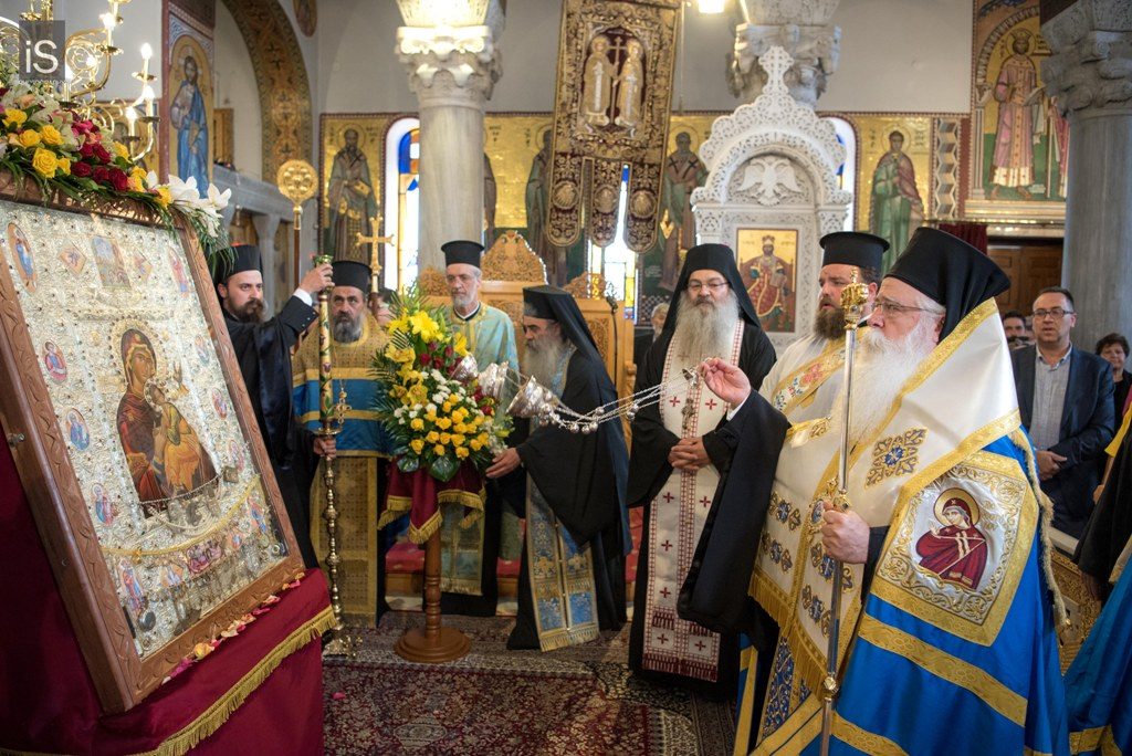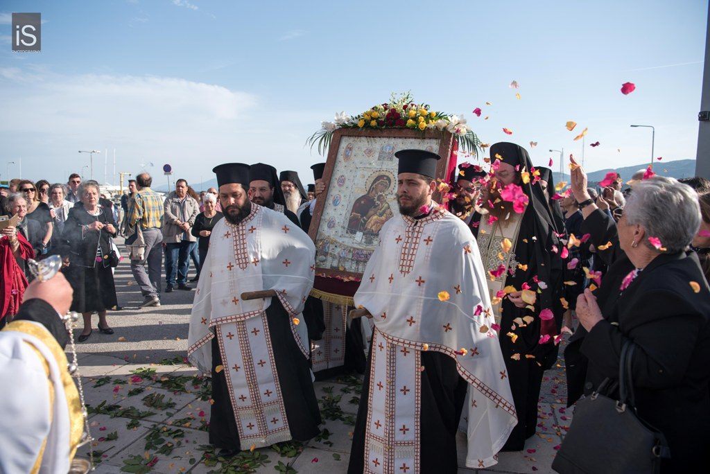 Πρόκειται για την ιερά και θαυματουργή Εικόνα της Παναγίας Φοβεράς Προστασίας, που φυλάσσεται στην Ιερά Μονή Κουτλουμουσίου Αγίου Όρους και εκόμισε στην πόλη μας ο Ιερομόναχος Φιλόθεος Κουτλουμουσιανός. Η Ιερά Εικόνα αφίχθη διά θαλάσσης στον Ναό, όπου την υποδέχθηκε επισήμως ο Σεβ. Ποιμενάρχης μας κ. Ιγνάτιος, επικεφαλής του ιερού Κλήρου, των Αρχών και του ευσεβούς λαού.