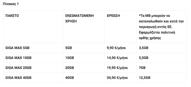 Τα πακέτα GIGA MAX αφορούν πλοήγηση στο διαδίκτυο. Η ογκοχρέωση για την πλοήγηση στο διαδίκτυο γίνεται ανά KByte, με ελάχιστη χρέωση το 1 KByte ανά σύνδεση (1 ΜByte=1.024 KBytes).