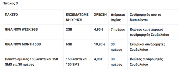 Δ) Η εμπορική διάθεση, για νέους και υφιστάμενους ιδιώτες συνδρομητές καρτοσυμβολαίου COSMOTE και για εταιρικούς συνδρομητές COSMOTE Business Mobile Cost Control, του νέου πρόσθετου πακέτου «GIGA NOW MONTH 2GB». Επιπλέον , το υφιστάμενο πακέτο GIGA NOW MONTH μετονομάζεται σε «GIGA NOW MONTH 1GB» και η τιμή του μειώνεται από 7€ σε 6,90€.