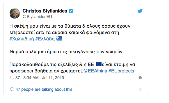 Συλλυπητήρια στα θύματα της κακοκαιρίας στη Χαλκιδική έστειλε, μέσω Τwitter, ο επίτροπος Ανθρωπιστικής Βοήθειας, Χρήστος Στυλιανίδης, δηλώνοντας την «ετοιμότητα» της Επιτροπής για την προσφορά βοήθειας. «Η σκέψη μου είναι με τα θύματα και όλους όσοι έχουν επηρεαστεί από τα ακραία καιρικά φαινόμενα στη Χαλκιδική. Θερμά συλλυπητήρια στις οικογένειες των νεκρών. Παρακολουθούμε τις εξελίξεις και η ΕΕ είναι έτοιμη να προσφέρει βοήθεια αν χρειαστεί», έγραψε ο Κύπριος επίτροπος.