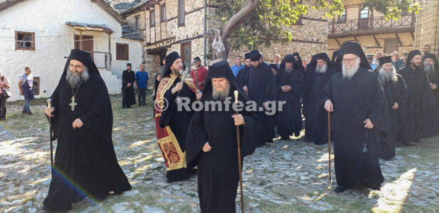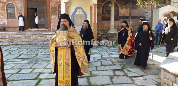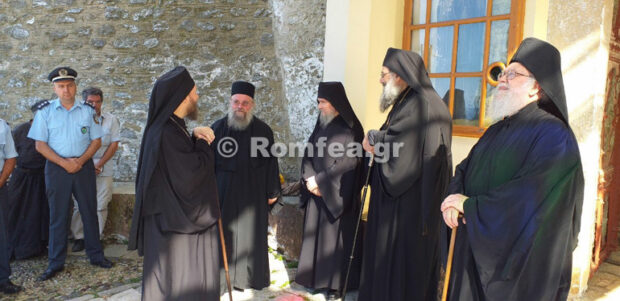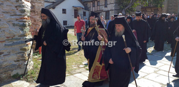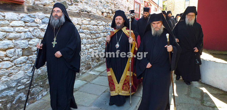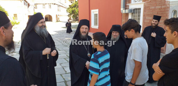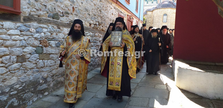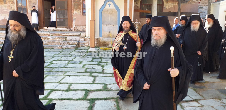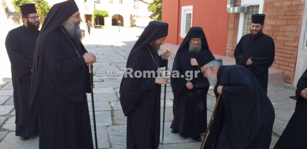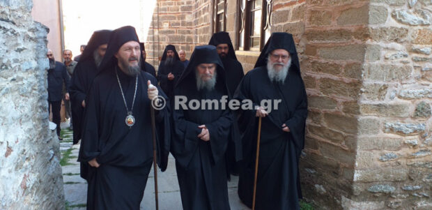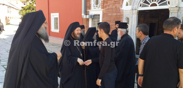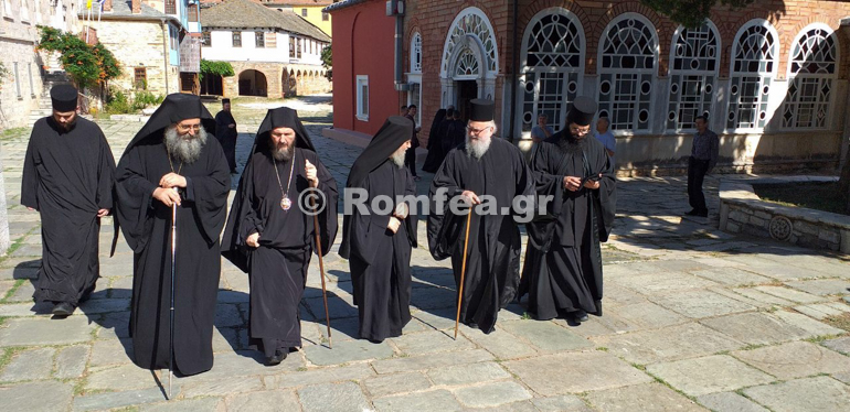 Τον Σεβασμιώτατο υποδέχθηκαν στην είσοδο της Μονής, ο Καθηγούμενος της Ι.Μ.Μ. Λαύρας, Γέροντας Πρόδρομος, ο Καθηγούμενος της Ι.Μ. Ιβήρων, Γέροντας Ναθαναήλ, η αδελφότητα και πλήθος προσκυνητών.