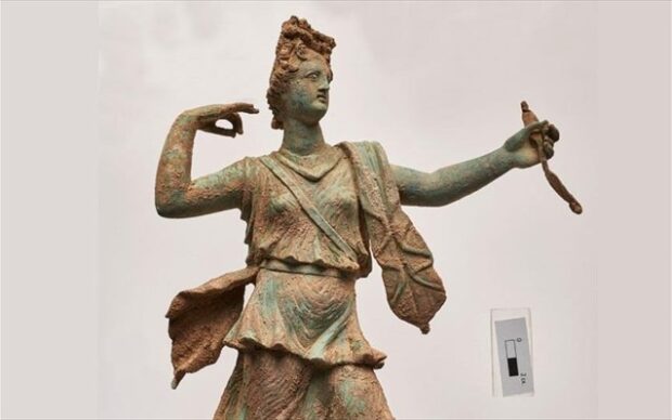 Όπως αναφέρει η ανακοίνωση, «η Άρτεμις, προστάτιδα θεά της Απτέρας, έχει κατασκευαστεί από χαλκό, ενώ ο δίδυμος αδελφός της Απόλλων, από μάρμαρο. Η θεά, πάνω σε περίτεχνη χάλκινη βάση σχήματος κιβωτιδίου, αποδίδεται με τον κοντό ζωσμένο χιτώνα της, σε έντονο διασκελισμό, έτοιμη να τοξεύσει. Αν και πιο λιτή, η στάση του Απόλλωνος μορφοποιεί μια ισχυρή εσωτερική ένταση.