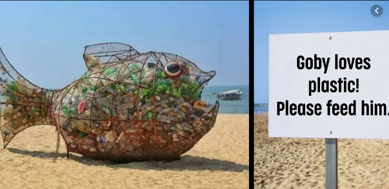 Στην ουσία, πρόκειται για ένα τεράστιο κάδο-μεταλλική εγκατάσταση σε μορφή ψαριού που συνοδεύεται από την επιγραφή: «Ο Γκόμπι λατρεύει τα πλαστικά, σας παρακαλώ ταΐστε τον».
