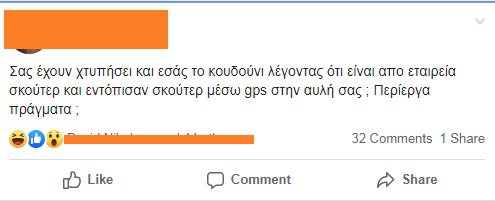 Ένα περίεργο περιστατικό αναφέρθηκε προ ημερών σε δημοφιλές γκρουπ στο Facebook, από μία χρήστη η οποία «κατήγγειλε» το εξής: «Σας έχουν χτυπήσει και εσάς το κουδούνι, λέγοντας σας πως είναι από εταιρεία με σκούτερ και πως εντόπισαν, μέσω GPS, ένα σκούτερ στην αυλή σας; Περίεργα πράγματα».