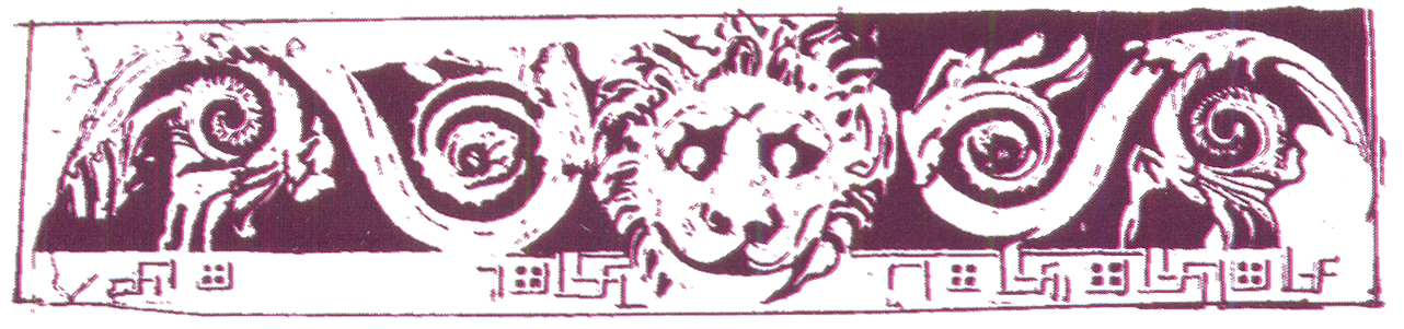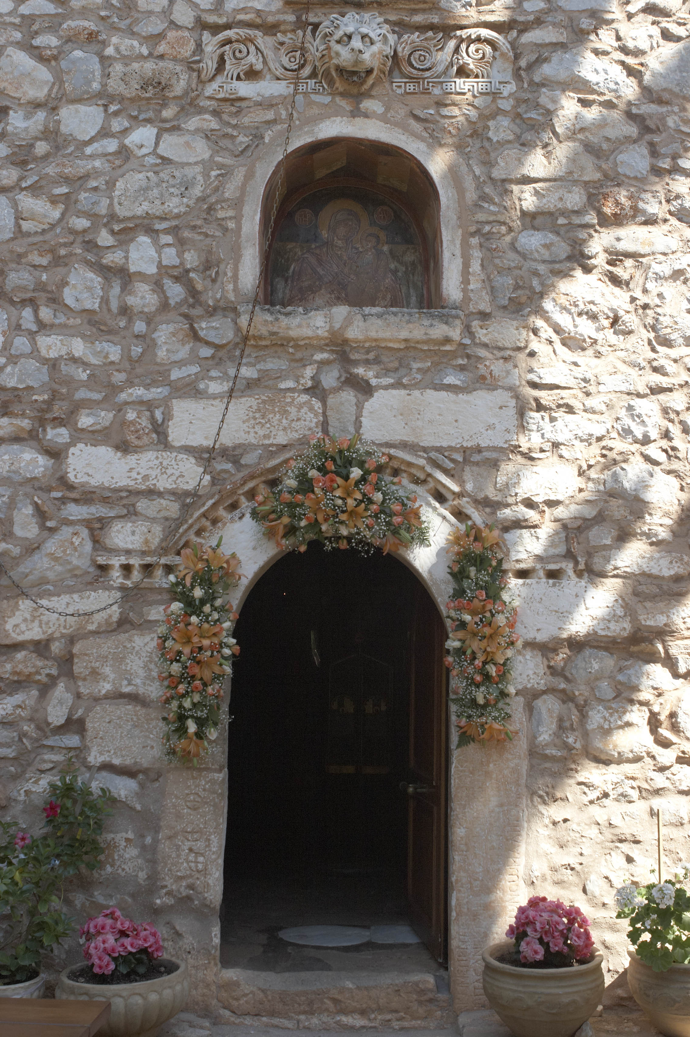 Μια οδοντωτή κεραμική ταινία περιτρέχει παράλληλα το τόξο επάνω από τη θύρα. Στις άκρες κάμπτεται σε μικρή οριζόντια προέκταση. Πιο πάνω από τη διακοσμητική αυτή ταινία, ανοίγεται η γνωστή ημικυκλική κόγχη, αγιογραφημένη με την εικόνα της βρεφοκρατούσας Παναγίας. Λίγο ψηλότερα έχει εντοιχισθεί ένα μαρμάρινο γλυπτό, διαστάσεων 1,20Χ0,30 μ. με μαίανδρο και ακάνθινα φύλλα. Στο μέσον του προεξέχει εντυπωσιακή μαρμάρινη λεοντοκεφαλή. Πιστεύεται ότι προέρχεται από υδρορροή αρχαίου μνημείου του γειτονικού Ασκληπιείου. Σύμφωνα με άλλη άποψη στην ίδια θέση υπήρχε αρχαίος ναός.