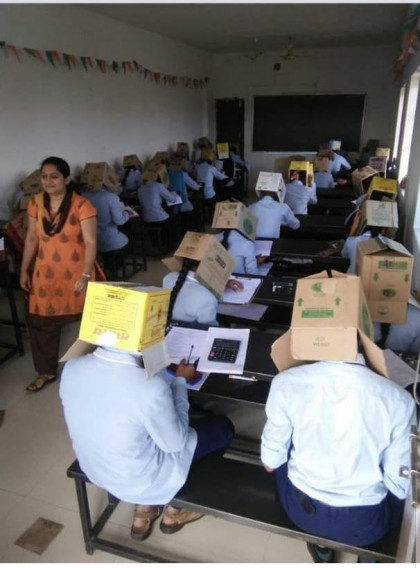 Οι φωτογραφίες τραβήχτηκαν στην διάρκεια εξετάσεων στο μάθημα της Χημείας στο Bhagat Pre-University College της πόλης Haveri και δείχνουν μαθητές να φορούν στο κεφάλι τους χάρτινες κούτες, προκειμένου να μην μπορούν να αντιγράψουν από τους διπλανούς τους.