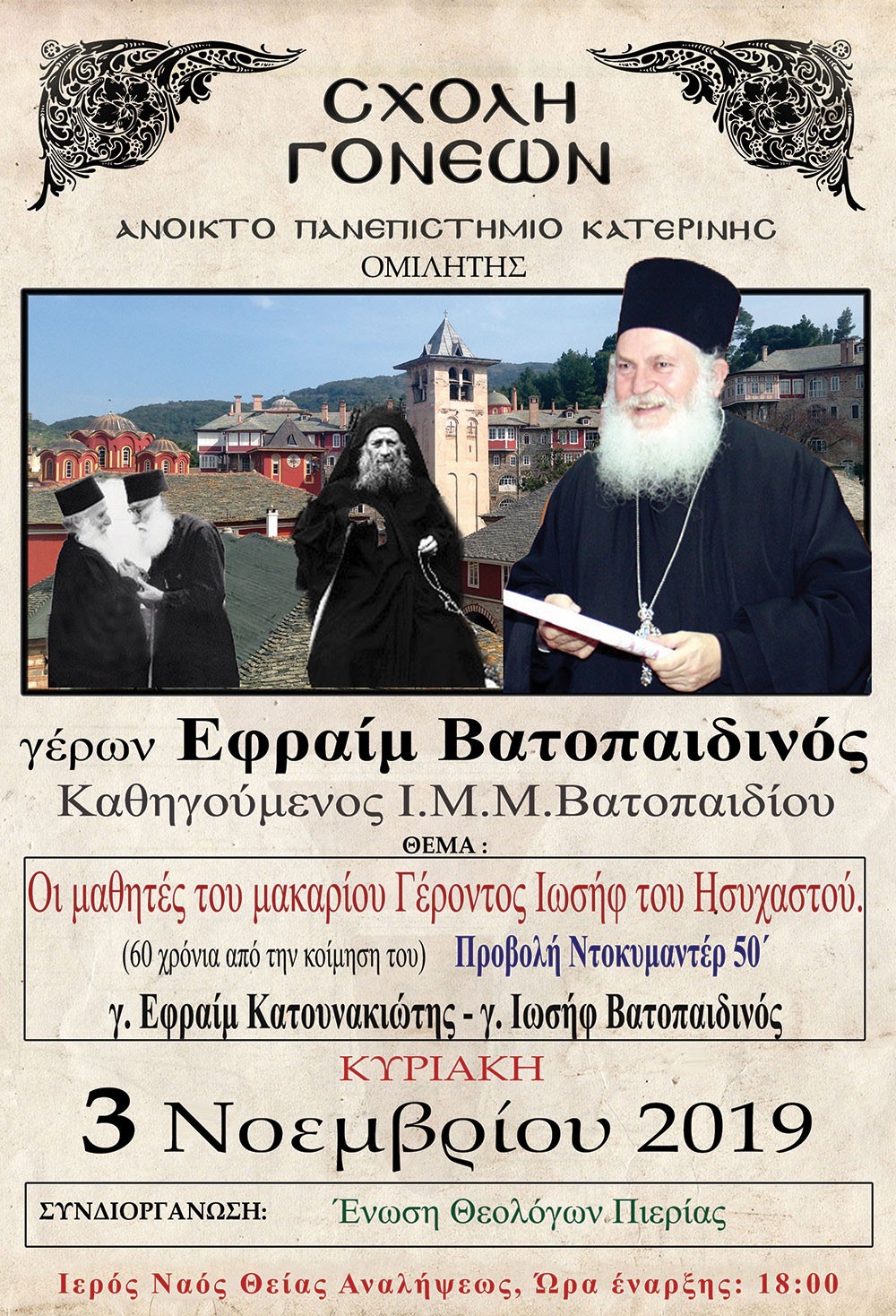Η Σχολή Γονέων – Ανοικτό Πανεπιστήμιο Κατερίνης διοργανώνει εκδήλωση με ομιλητή τον Γέροντα Εφραίμ Βατοπαιδινό, Καθηγούμενο της Ιεράς Μεγίστης Μονή Βατοπαιδίου.