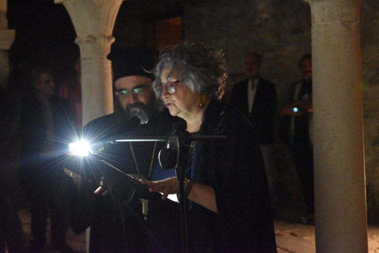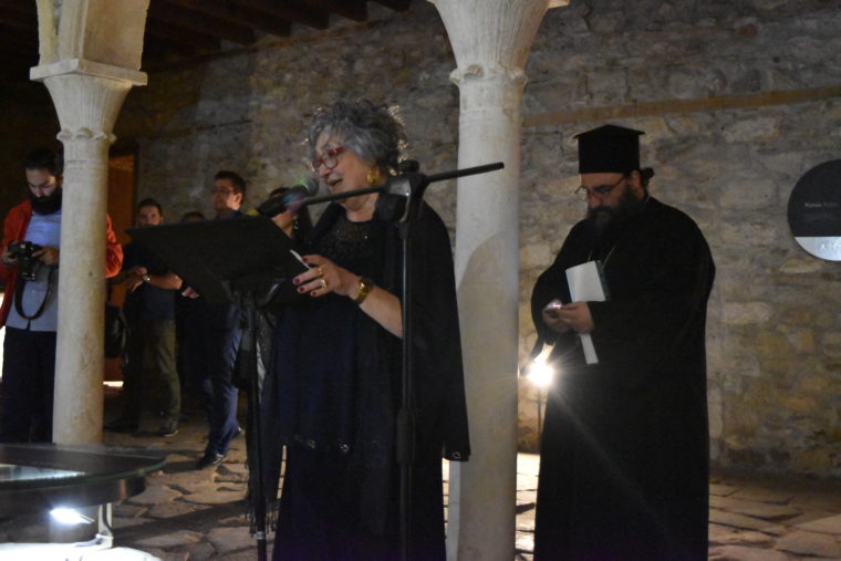 Η κα Φίλη και ο π. Θεοδόσιος απευθύνουν χαιρετισμό στα εγκαίνια της έκθεσης. Φωτογραφία: «Εθνικός Κήρυξ»/ Αναστάσιος Κουτσογιάννης