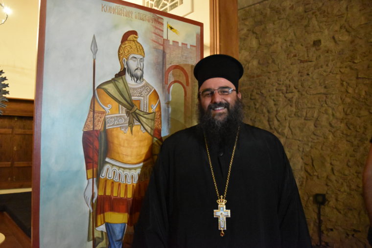 Ο π. Θεοδόσιος Οικονομίδης μπροστά από τον πίνακα του Κωνσταντίνου ΙΑ΄ Παλαιολόγου που φιλοτέχνησε ο ίδιος. Φωτογραφία: «Εθνικός Κήρυξ»/ Αναστάσιος Κουτσογιάννης