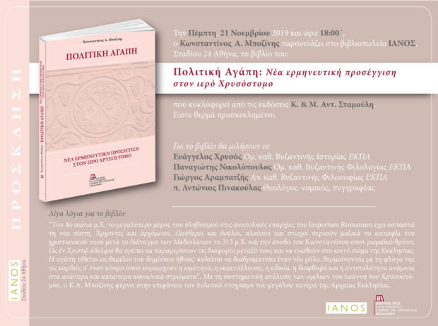 Ο Κωνσταντίνος Μποζίνης παρουσιάζει στον απόψε στο βιβλιοπωλείο IANOΣ της Αθήνας (Σταδίου 24), στις 18:00, το βιβλίο του “Πολιτική Αγάπη: Νέα ερμηνευτική προσέγγιση στον ιερό Χρυσόστομο”, που κυκλοφορεί από τις εκδόσεις Κ. & Μ. Αντ. Σταμούλη.